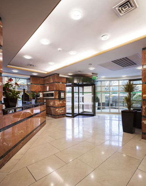 The entrance to the building is by way of an impressive foyer with polished granite floor and wall finishes. Internally, the offices provide adaptable and flexible work space. All floors are L shaped with a central core allowing for sub-division of the floor plate.